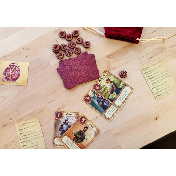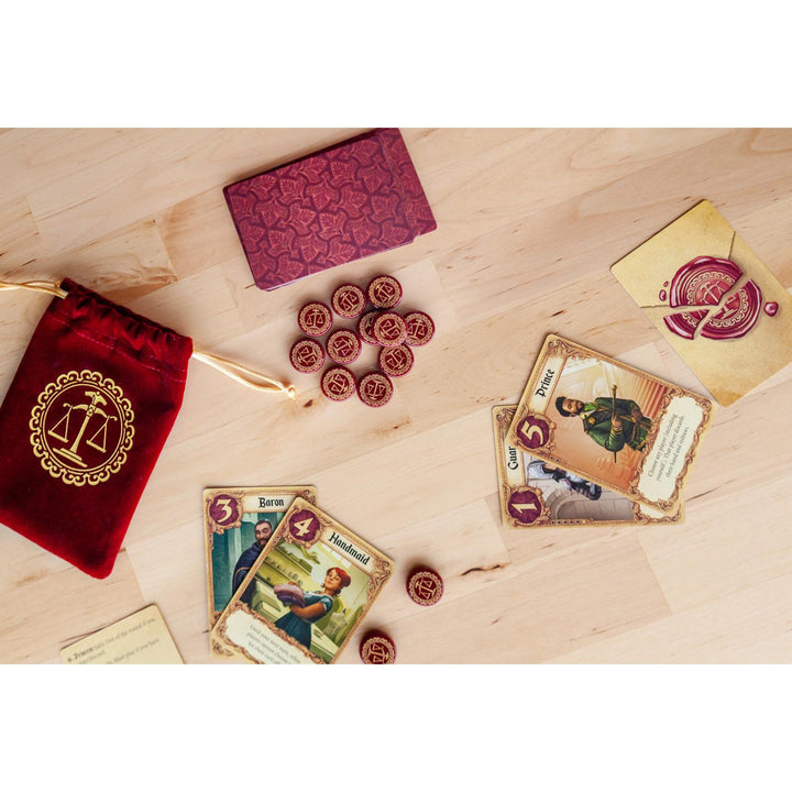 Your goal is to get your love letter into Princess Annette's hands while deflecting the letters from competing suitors. From a deck with only sixteen cards, each player starts with only one card in hand; one card is removed from play. On a turn, you draw one card, and play one card, trying to expose others and knock them from the game. Powerful cards lead to early gains, but make you a target. Rely on weaker cards for too long, however, and your letter may be tossed in the fire!