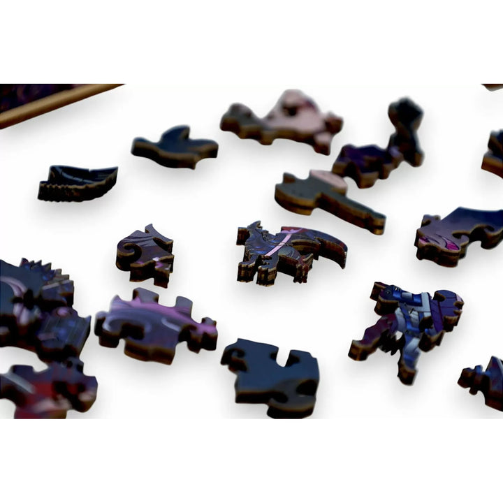 Build your favourite high-fantasy creature! Make a fun puzzle of a dangerous dragon with a funky fantasy colour palette. Chunky wooden pieces. Mysterious fantasy archetypes make an appearance as the pieces. 200 pieces. Perfect for kids! Irregular cut pieces 5 different creatures in Series 1! Collect them all!