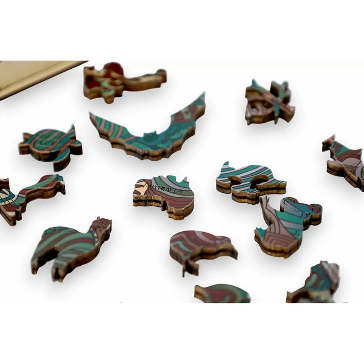 Build your favourite Oceanian critters! Make a fun puzzle of a quirky Kakapo with a fun Australian colour palette. Chunky wooden pieces. Iconic Australian animals make an appearance as the pieces. 200 pieces. Perfect for kids! Irregular cut pieces 4 different animals in Series 1! Collect them all!