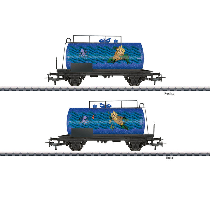This is a tank car in a great design for the superhero Aqua Man. The tank is in an ocean blue with a glitter effect, goes with the underwater ocean world of Aqua Man. The car has RELEX couplers for fast and easy coupling. Car length 12 cm / 4-3/4". An Aqua Man toy figure made of metal is included. Size of the toy figure 4 cm / 1-9/16". DC wheelset E700580 available separately.