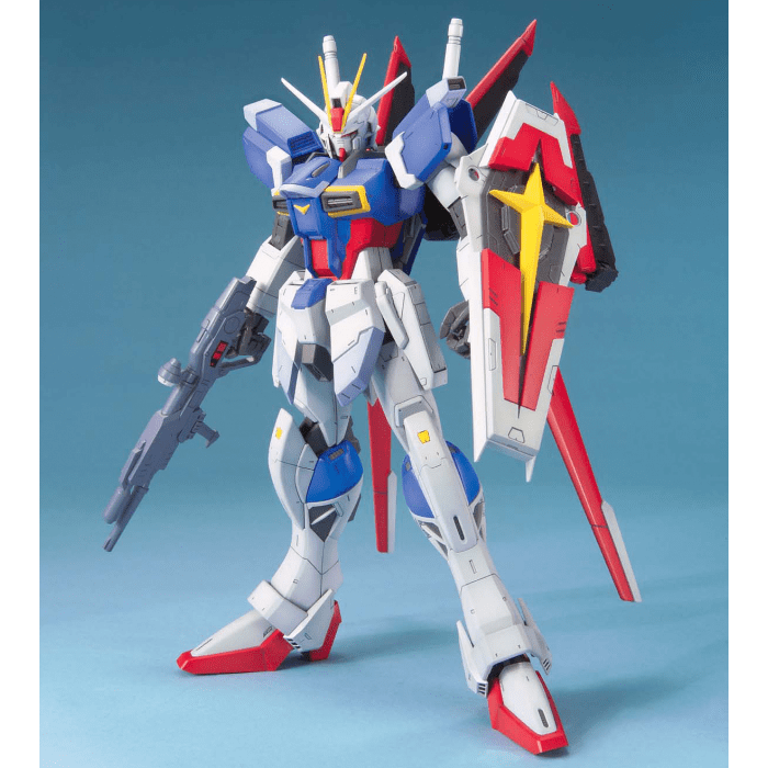Weapons include an anti-ship laser sword, a beam rifle, an openable shield, and two beam sabers. Unpainted 1/100-scale figures of Shinn Asuka and Lunamaria Hawke (both molded in white) are packed in the set along with foil stickers, dry-transfer decals, and marking stickers to add detail to the completed model.