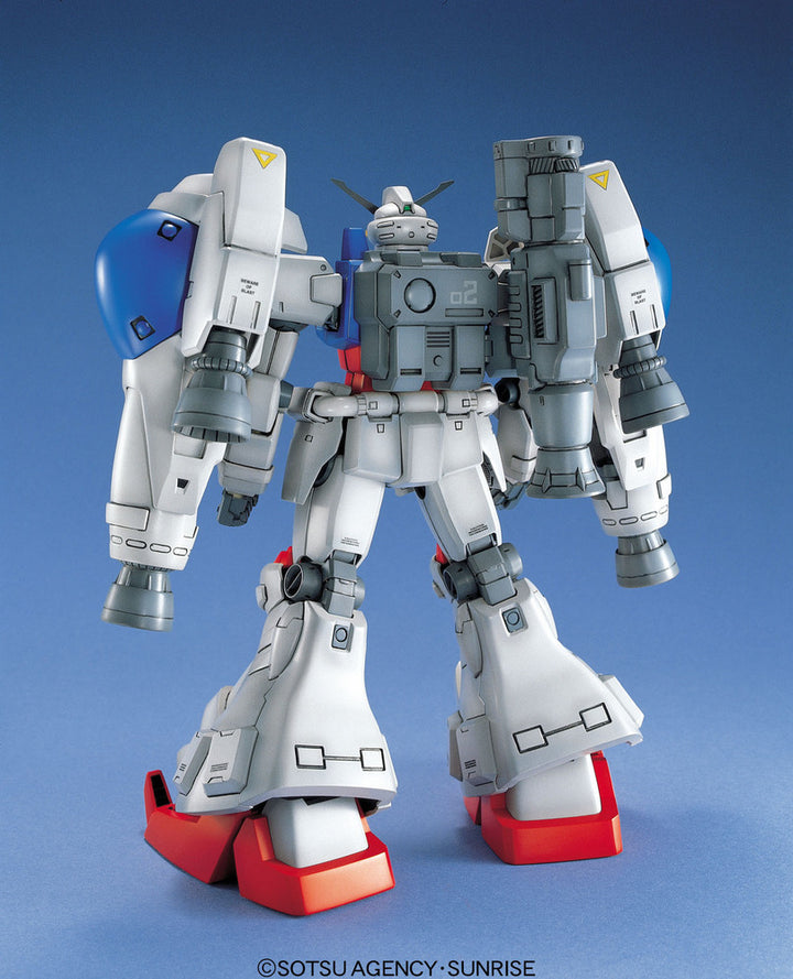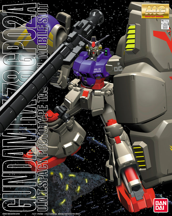 As usual, everything on the kit moves. Those shoulder “binders” are particularly interesting, especially the way the outer nozzle pivots downward. The “atomic bazooka” can be mounted in the hand in firing position, or it breaks down into two pieces, the barrel mounting in the inside of the shield (see photo), with the remainder mounting on the GP02's back.