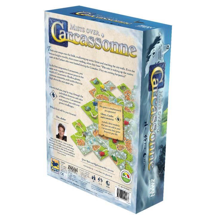 Mists over Carcassonne includes 45 meeples in two new types and 60 tiles that match the graphics of the 2021 edition of Carcassonne, and this game includes rules for how to incorporate material in a regular competitive game of Carcassonne. The base game is not required to play but can be used in conjunction to enhance the game.