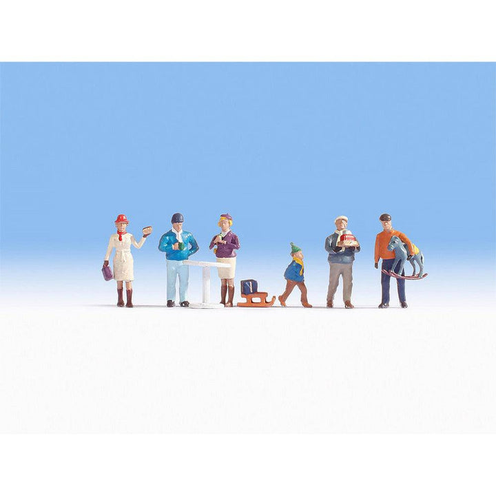 Every year the nicest figures in scale H0 are realized as N scale Figures. Now it is the turn of the Christmas Market. The set contains 6 model figures in scale 1:160. Also some accessories including a bar table, sledge and a rocking horse are featured too. All figures wear appropriate winter clothing - caps, scarves, gloves and warm winter jackets. A small boy pulls a sledge with a gift package. There’s a couple standing on a white bar table, mulled wine is flowing and a father has just bought a rocking horse as Christmas gift for his son. As in real life, the model figures are in a pre-Christmas rush to organise the last little things for the Christmas celebrations.