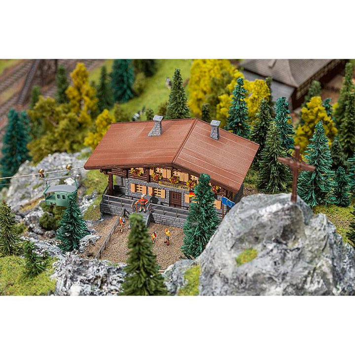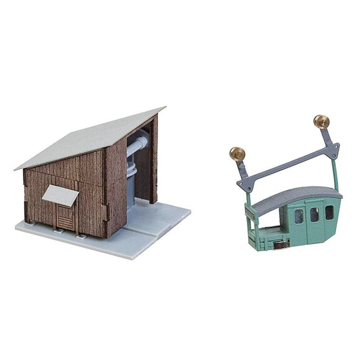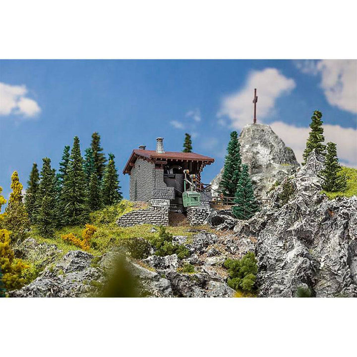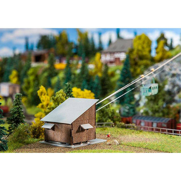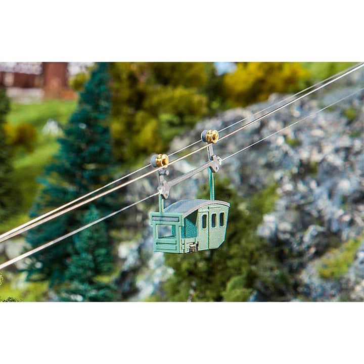 Material and passenger cable car, together with mountain and valley station, with drive motor and control in a practical set. The single-track mini-cable car with closed gondola serves for the transport of goods or as a person-carrier at high altitudes. While the valley station, which is manufactured using the laser-cut process, is made of real wood and a pitched roof made of special cardboard, a massive alpine hut with a terrace and a solidified foundation serves as a mountain station. The accessories include fence elements and a summit cross.