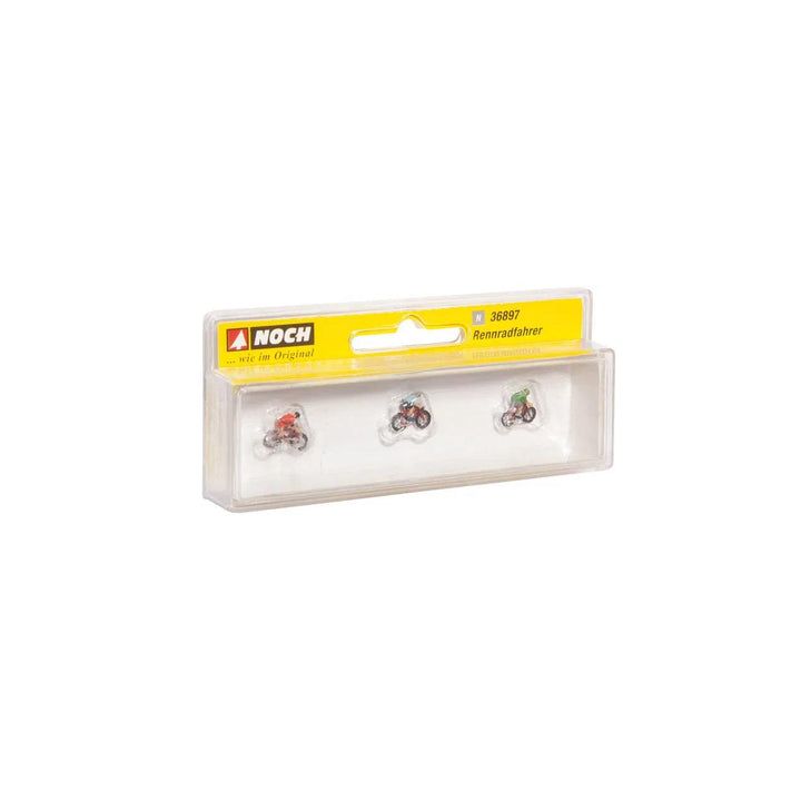The NOCH Figures “Racing Cyclists” in N gauge match perfectly with a beautifully designed model landscape full of nature, where cyclists like to spend their free time. Alongside mountain bikers or a family going on a relaxing bike ride, the “Racing Cyclists” should not be missing! At their fast speed, they pedal long distances in summer. They are a real eyecatcher on any NOCH model landscape and liven up a diorama. Fun and sweat are guaranteed!