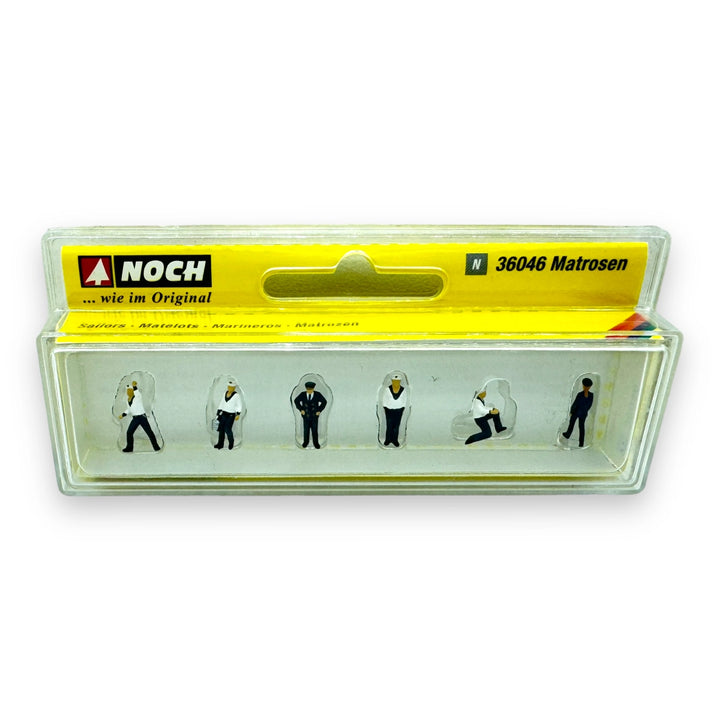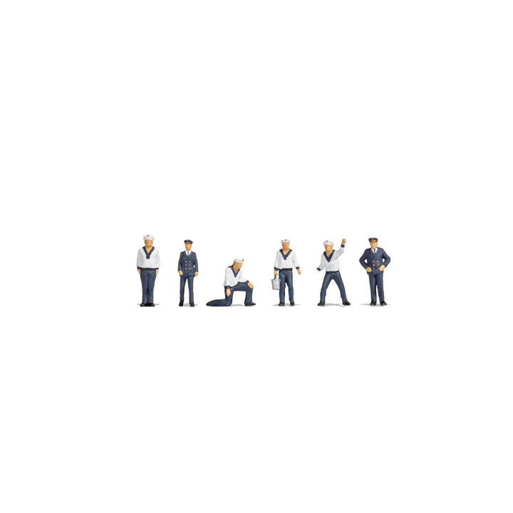 The set in N gauge includes six male sailors. Three of them wear typical work clothes consisting of dark trousers and a white sweater with a dark band on the sleeves and collar. In addition, a white sailor's cap sits on their heads. The two other sailors are wearing a dark suit with a shirt and tie. One of the sailors holds up his hand while the others kneel or hold a lantern to provide enough light. Two of the men are watching the action and another is doing a patrol of the ship.