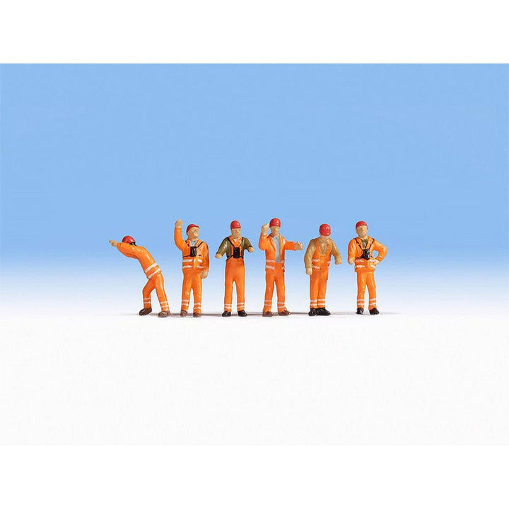 The set contains 6 model figures in scale 1:160 (scale N). The shunters wear orange work clothes with reflective safety strips, so they are seen at their work on the tracks, even in the darkness. All workers also wear a helmet for their own safety. The workers along the tracks must not be missed on the model railway layout. At the railway station there is always hustle and bustle so the shunters have been launched in 2018 for the friends of the small scales.