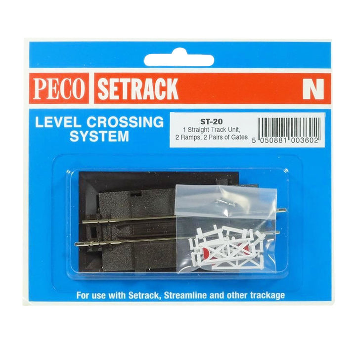 PECO Setrack N Gauge Code 80 - Unit trackage System. The high quality rigid unit trackage system suitable for all popular brands of N gauge model trains. Being fully compatible with both Code 80 and Code 55 PECO Streamline, it need never be discarded as your layout develops. The solid nickel silver rails are integrally moulded into the sleeper bases for maximum realism and strength. Turnouts are fitted with an over-centre spring for immediate use, no extra levers necessary. The ST-20 simply clips to the ST-21 to make a double track level crossing, further units can be added to cross multiple tracks. Perfect for model railway projects and a great addition to your railway model collection.