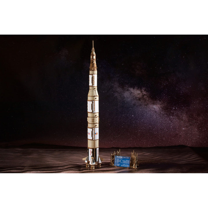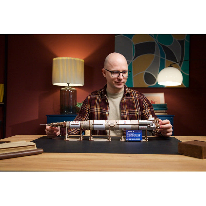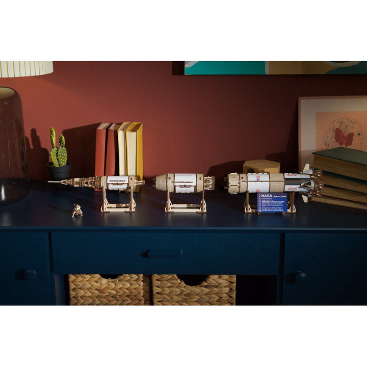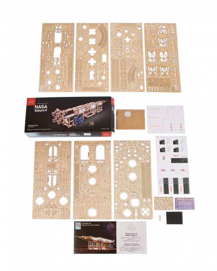 The Ugears NASA Saturn V three-stage rocket is rated "Advanced" level, for experienced builders, and makes a majestic display piece for your living room, bedroom or office. Like all Ugears wooden models and 3D puzzles, the Saturn V and all its component parts assemble without glue, and can be built without special tools, following the step-by-step, illustrated instructions in 11 languages (English, Ukrainian, German, Spanish, French, Italian, Portuguese, Polish, Japanese, Chinese, and Korean). Made from art-quality composite wood, Ugears models can be left in their attractive natural wood state, or colored, stained or painted in a color scheme of your choosing (paints not included). The Saturn V kit includes several spare parts in case of breakage during assembly, and you can always contact our customer service team for additional replacement parts, free of charge (including shipping). We can also answer questions or help troubleshoot if you encounter any difficulties during your build.