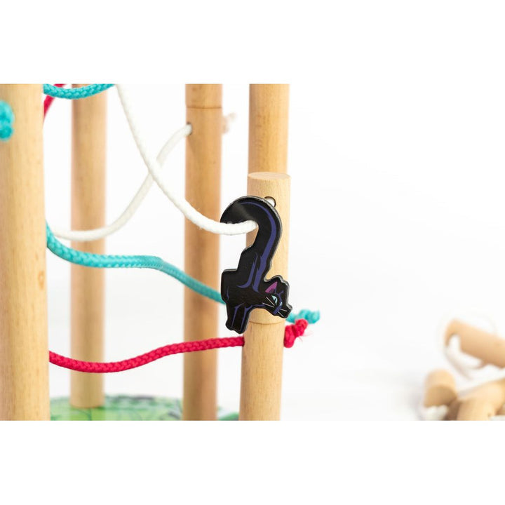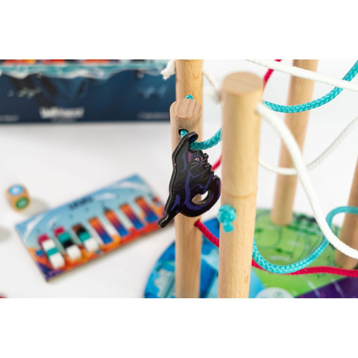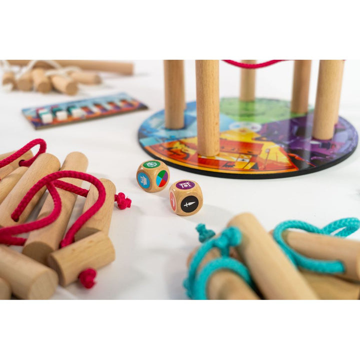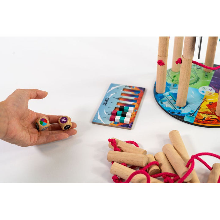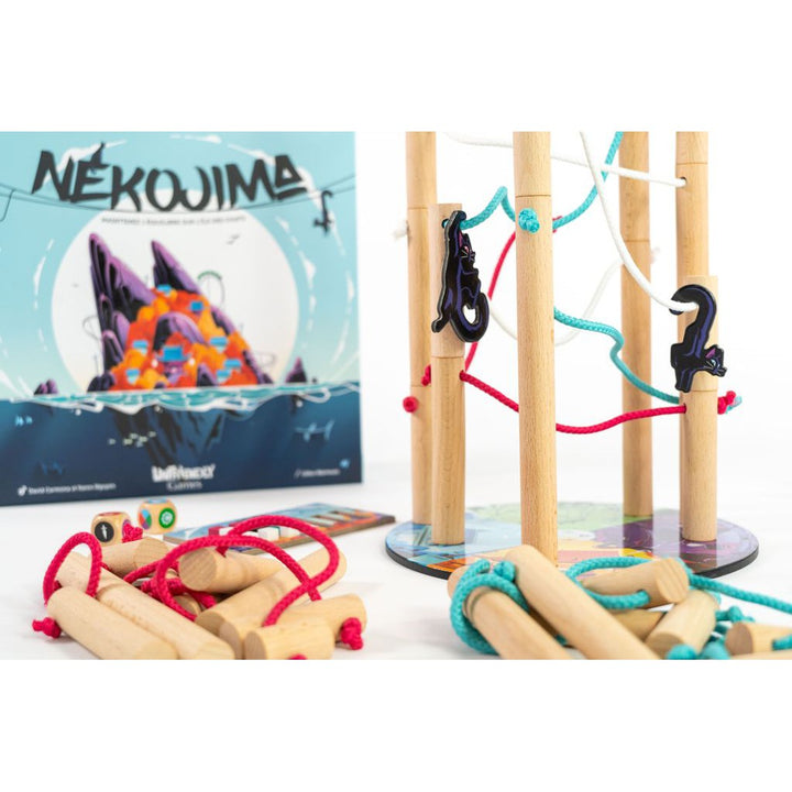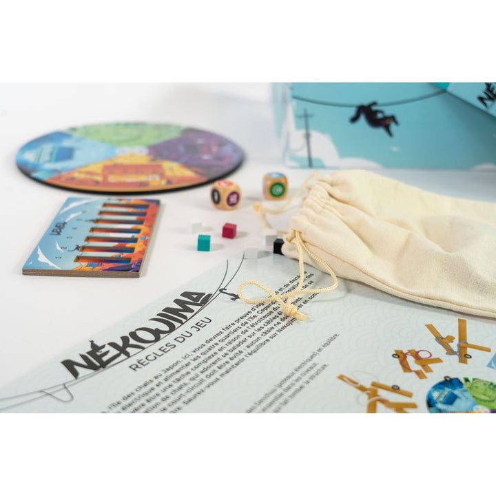 Nekojima is a wooden game of skill and dexterity in which you have to keep an entire installation in balance. Players take turns placing or stacking denchuu — 電柱, or electrical poles — respecting the locations without any hanging cables touching. Be careful not to be the one to bring down the structure. This game requires reflection, concentration and skill.