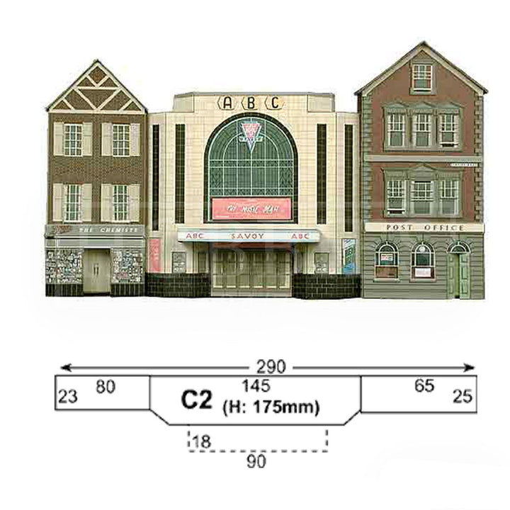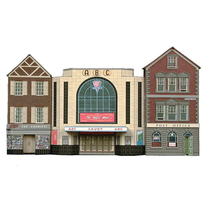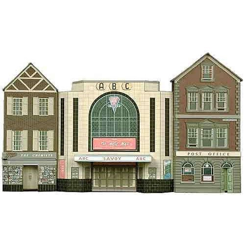 Superquick pre-cut low relief card model kit comprises a Boots pharmacy, an ABC cinema, and a post office and could be found on many high streets and will add a detailed backdrop to the edge of an urban layout which can be used on any OO and HO scale model railway.