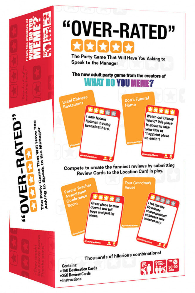 Overrated is the game of ridiculous reviews where players compete to match the funniest “Review” card with the “Location” card for each round. Players rotate drawing a Location card while the rest of the group competes to play the funniest Review card. Once everyone has played their chosen Review card, the rotating judge awards a point to the funniest one. The player with the most points at the end of the game takes the crown. Brought to you by the creators of What Do You Meme.
