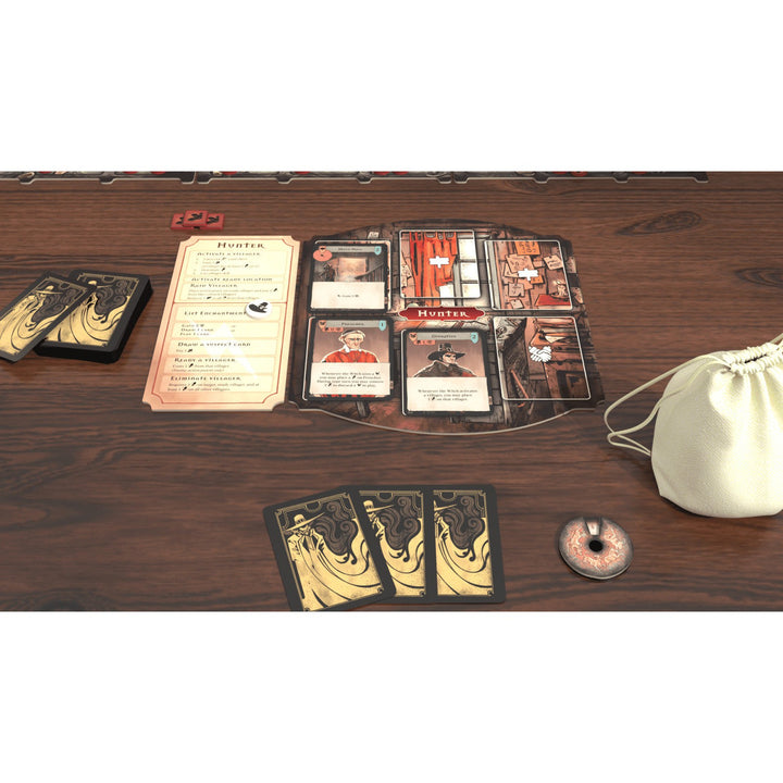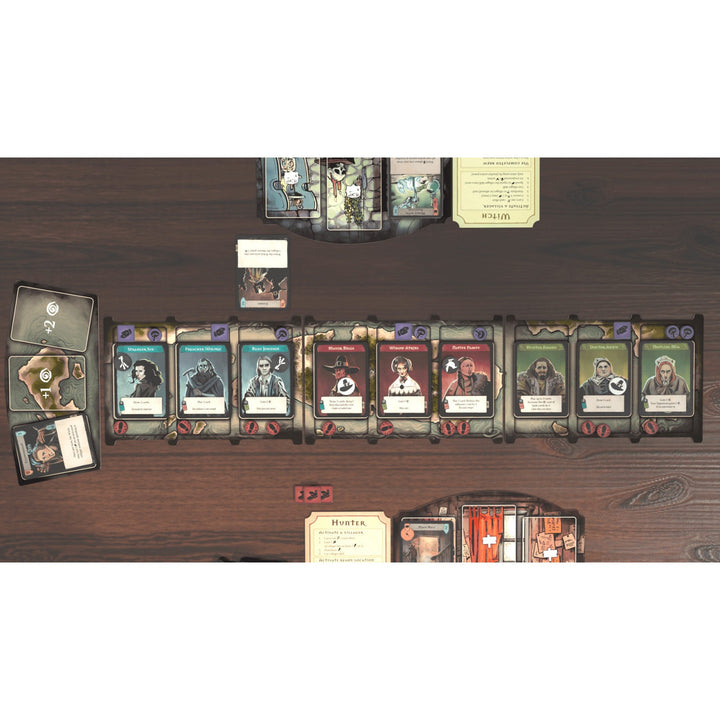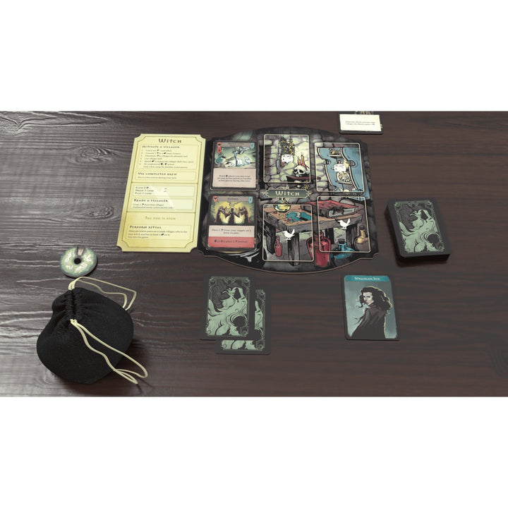 The essence of this asymmetrical game is a witch's struggle against a witch hunter. As the witch strives to complete a ritual of renaturation, the hunter tries to discover her true identity among nine villagers. Each turn, the two players use their action pawns on active villagers to draw cards, play cards, and gain influence. Each player has their own variable card deck of fifty cards; with these cards, the witch can brew powerful potions, improve their familiar, and cast enchantments and charms, while the witch hunter enlists allies, claim strategic locations, and ruthlessly investigates the villagers.