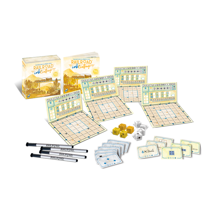 Railroad Ink Challenge™ has everything you love from the original Railroad Ink games and a lot more, with an all-new focus on player interaction. Roll the dice and draw the routes to connect the exits around your board. Expand your network with railways, highways, and stations to collect points, but you will be penalised for any open connections, so plan carefully!