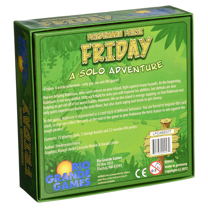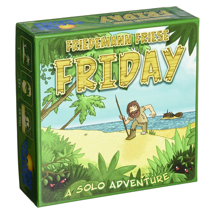 Friday is a solo adventure - only you can win the game! You are helping Robinson, who came ashore on your island, fight against many hazards. At the beginning, Robinson is not very skillful. With each fight he wins you will improve his abilities, but defeats are also helping to get rid off of his worse habits. However, life on the island is energy-sapping, so that Robinson not only gains experiences during his time there, but also starts aging and tends to get clumsy. In this game, Robinson is represented as a card stack of different behaviors. You are forced to improve this card stack, so you can collect the cards at the end of the game to give Robinson the best chance to win against the tough pirates!
