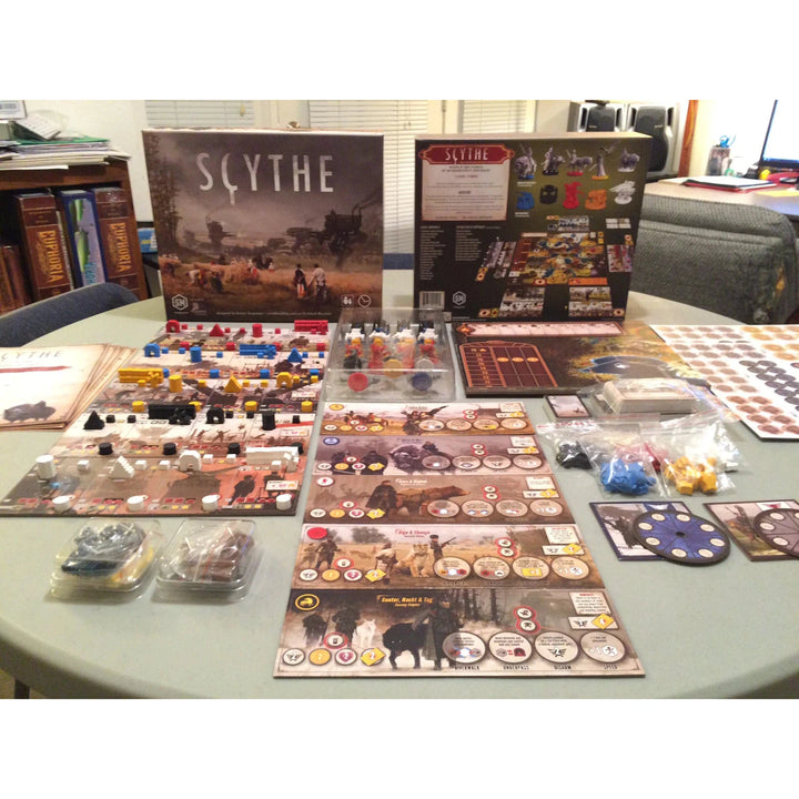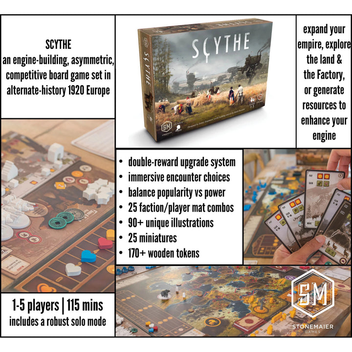 Scythe is an engine-building, asymmetric, competitive board game set in an alternate-history 1920s period. It is a time of farming and war, broken hearts and rusted gears, innovation and valor. It plays 1-5 players in about 115 minutes, and it features art & worldbuilding by the acclaimed Jakub Rozalski.