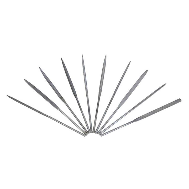 Grind! 10-part, high-quality file set. Ideal for the finest manual machining work of all kinds. Length of the files: 140 mm. Different shapes: flat, round, semicircular, triangular, square.