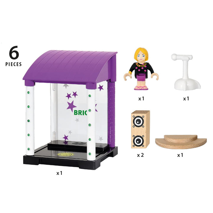 -Comes with 6 pieces including a stage, microphone, play figure and more