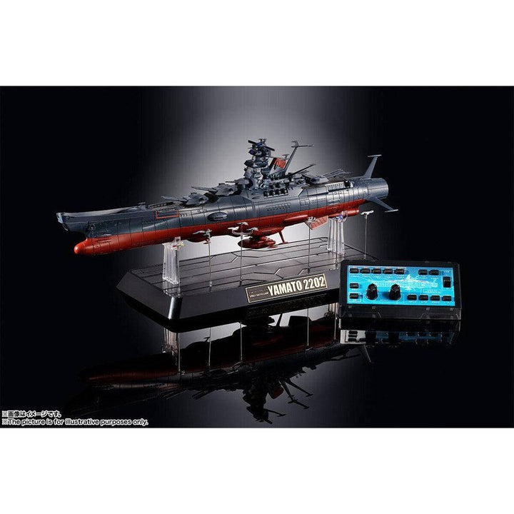 The massive namesake of "Space Battleship Yamato 2202" joins the Soul of Chogokin series! It's packed with features, including light-up Wave Motion Gun, engine, and bridge, plus motorized turrets. A remote control lets you play key lines recorded by the voice actors for Susumu Kodai and Yuki Mori, plus a variety of other effects and music. The set includes the Yamato itself, a remote control, eight miniature fighters (Cosmo Zero, Tiger I, Tiger II (x2), Tsvarke, Cosmo Seagull, and "Ki" type search craft), detachable wings, rocket anchors (L/R), display stand, display stand arm set, and test batteries.