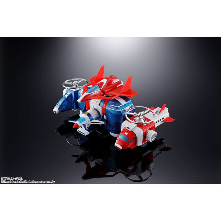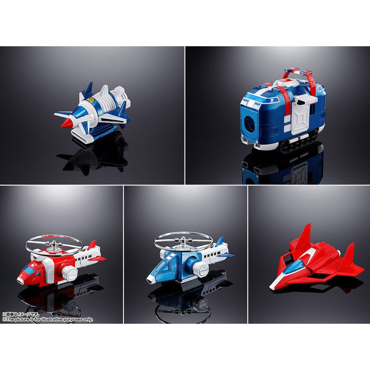 Fifteen vehicles combine into one massive robot! A long-awaited Soul of Chogokin edition of the globally popular super robot, it faithfully forms into the three Air, Land, and Sea Team combat modes as well as the towering GX-88 VOLTRON Ⅰ! The super-size set includes: #1 Command Jet Explorer; #2 Strato Weapons Module; #3 Air Recon Helicopter; #4 Air Recon Helicopter 2 #5 Falcon VT Fighter; #6 Communications Module; #7 Space Prober; #8 Space Prober; #9 Multi-Wheeled Explore; #10 Multi-Wheeled Explore; #11 Jet Radar Station; #12 Rotating Personnel Carrier; #13 Armored Equipment Carrie; #14 All-Terrain Space Vehicle; a stand; and two nameplates.