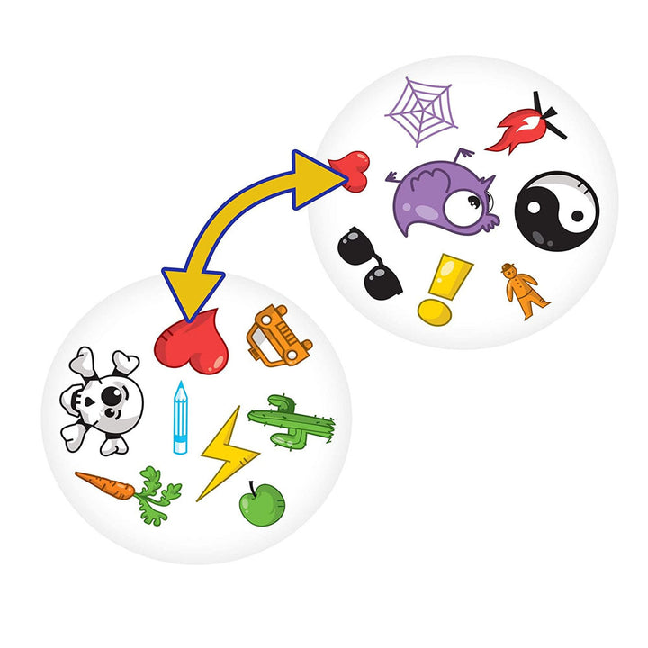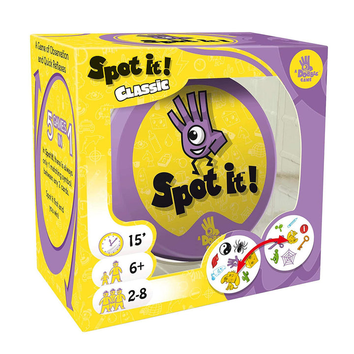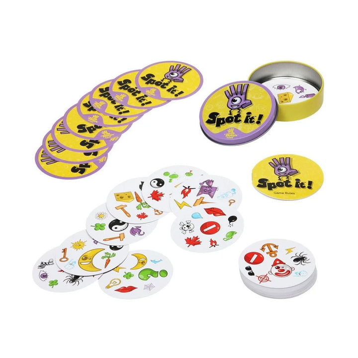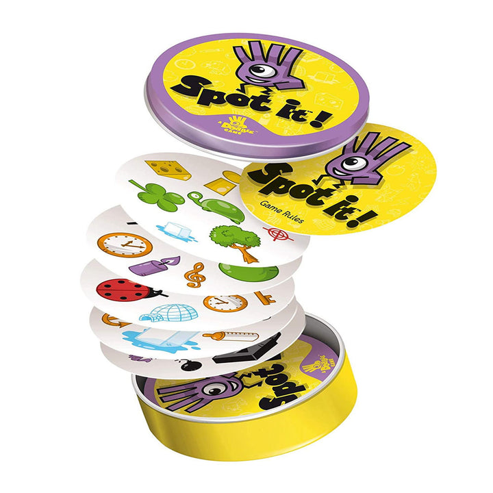 Spot it!, a.k.a. Dobble, is a simple pattern recognition game in which players try to find an image shown on two cards. Each card in original Spot it! features eight different symbols, with the symbols varying in size from one card to the next. Any two cards have exactly one symbol in common. For the basic Spot it! game, reveal one card, then another. Whoever spots the symbol in common on both cards claims the first card, then another card is revealed for players to search, and so on. Whoever has collected the most cards when the 55-card deck runs out wins! Dobble has 5 mini-games: all of them reliant on speedy observation, creating excitement for children and adults alike and keeping every player involved.
