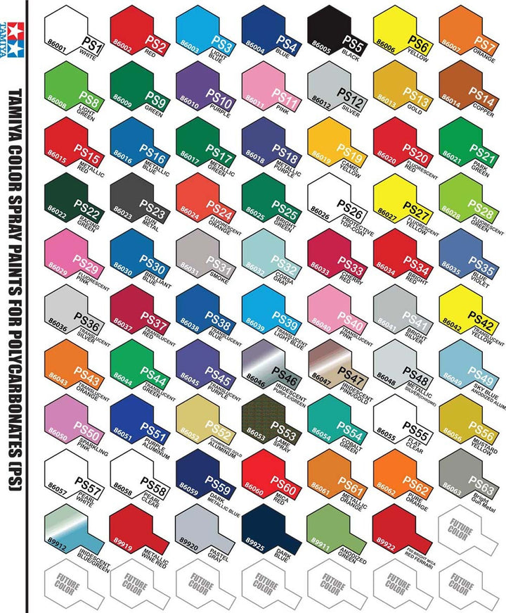 These spray paints were developed especially for decorating transparent polycarbonate bodies used in R/C car modeling. Each can contains 100ml of paint, which is the appropriate amount for finishing one complete model.