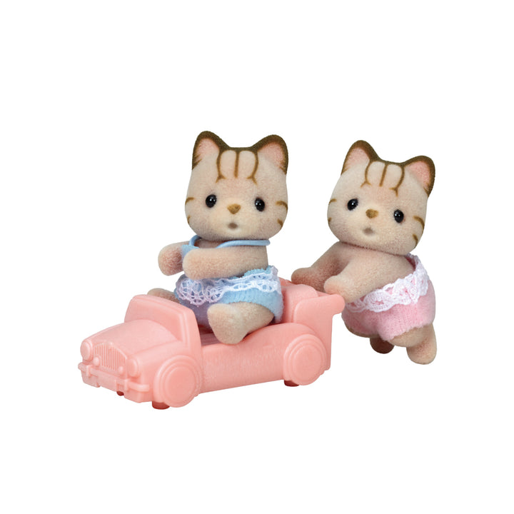 The Striped Cat Twins set includes the Striped Cat twins figures (one sitting and one crawling) and a ride-on toy. The figures can be posed by moving the head. Striped Cat Twins' heads can turn. The sitting Striped Cat Twin can fit inside the ride-on toy. Put the crawling Striped Cat Twin's hand on the ride-on toy handle to act out play pushing.