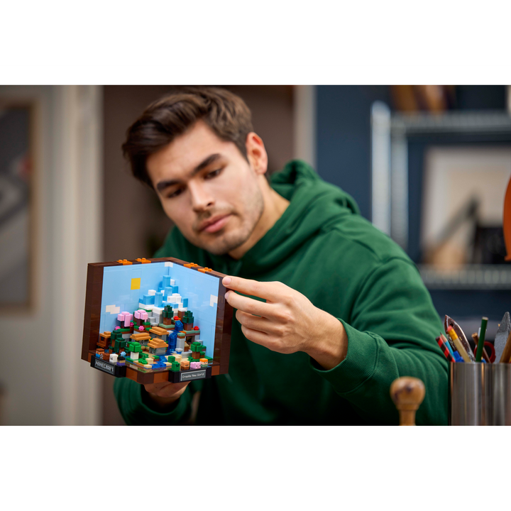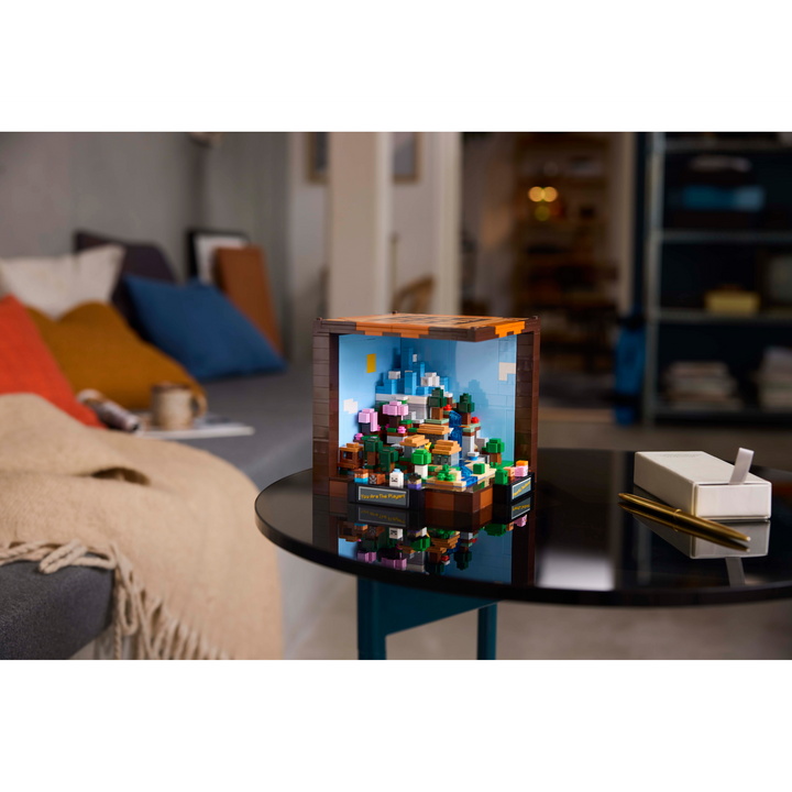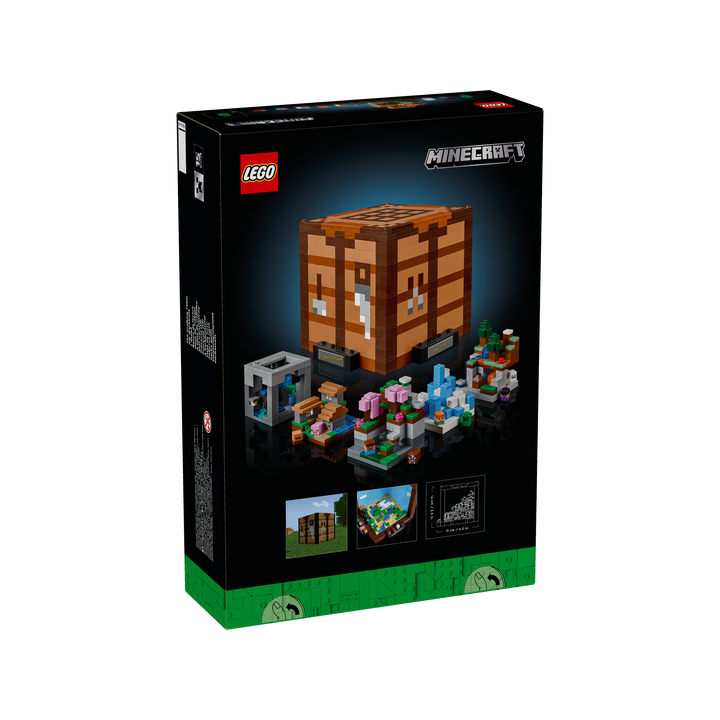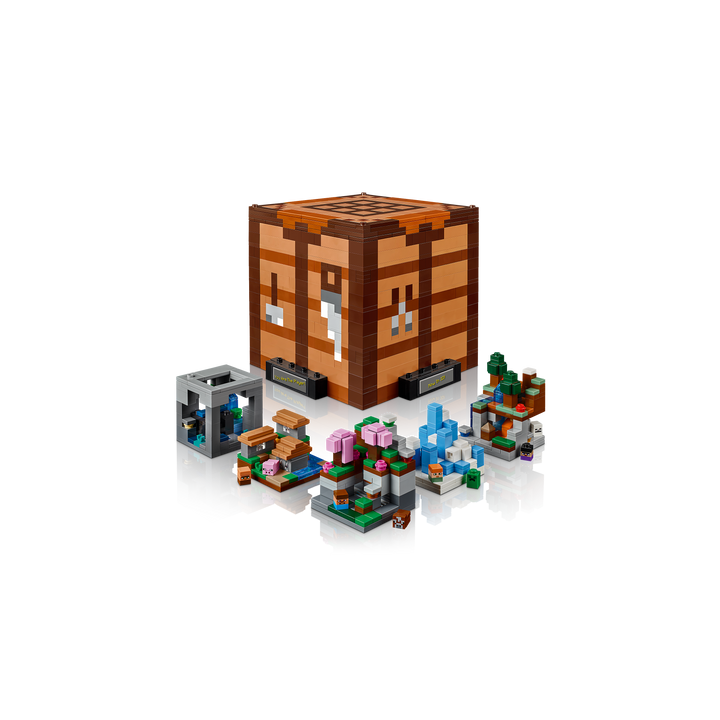 Celebrate the 15th anniversary of Minecraft® with this LEGO® set designed especially for adult players of the popular video game. This open-cube model of the iconic crafting table incorporates 8 microfigures and 5 mini build modules featuring 12 Minecraft biomes. The mini builds and figures can be removed from the main model to enable a variety of customized display possibilities.