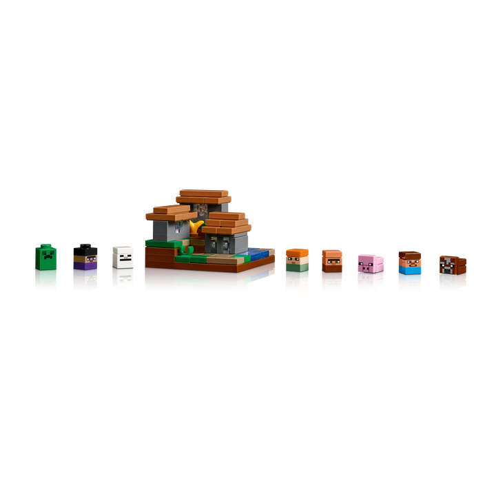 - Build-and-display Minecraft® model – 5 mini builds and 8 microfigures (Steve, Alex, a skeleton, witch, Creeper™, villager, cow and a pig) detach from the model for multiple display possibilities