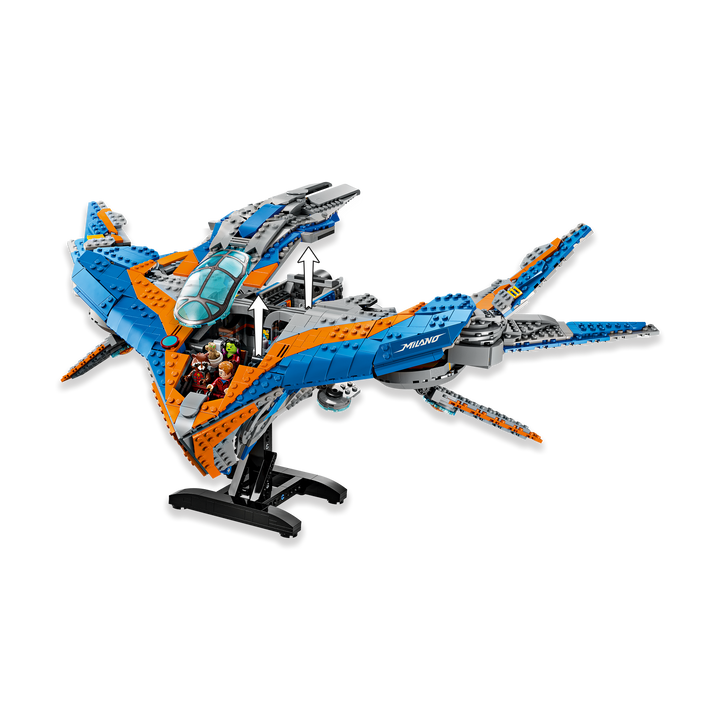 Race through space aboard the Guardians of the Galaxy Milano spaceship! With 6 adjustable wings, 4 movable rear boosters and Star-Lord, Gamora and Rocket in the flight deck, it’s going to be a thrilling ride! At the rear of the spaceship, Drax andBaby Groot are chilling in the rest area with a rockin’ tape deck – because every hero needs a cool soundtrack!