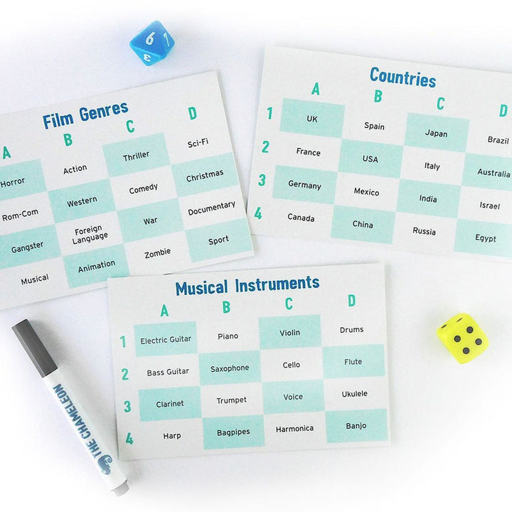 At the beginning of the round each player receives a card that tells them if they are the Chameleon or hunting the Chameleon. Two dice are rolled and this gives everyone (except the Chameleon) the coordinates to a specific word on a Topic Card – this is the Secret Word for the round. Each Topic Card features 16 related words (e.g. countries, books, food, etc.)