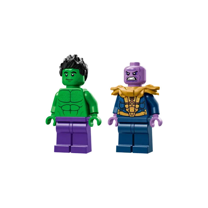 - LEGO® ǀ Marvel minifigures – The build-and-play toy includes a Hulk minifigure with a removable helmet and a Thanos minifigure with a Tesseract and Infinity Gauntlet