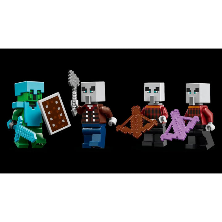 - 4 Minecraft® figures – Includes 3 illagers, 1 hero character and a variety ofauthentic accessories, including a diamond sword, shield and armor