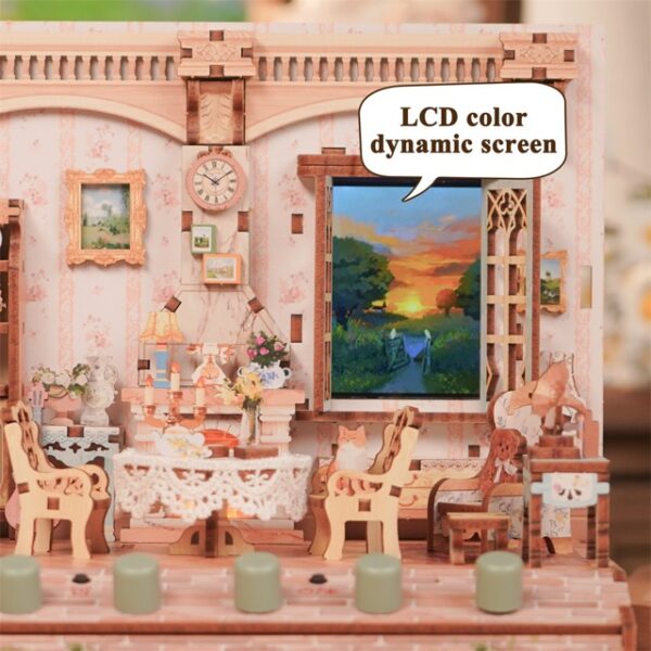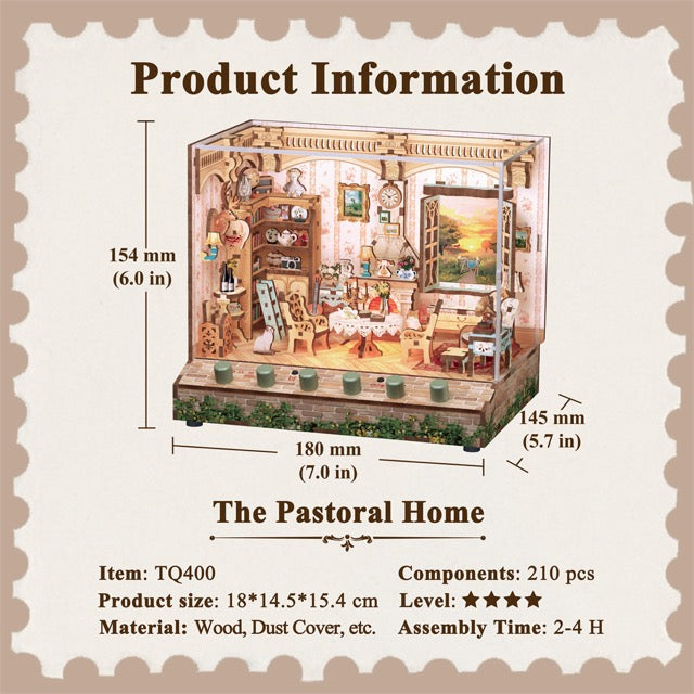 Escape into the peaceful charm of the countryside with The Pastoral Home Miniature House Sound Machine. This exquisite DIY kit recreates the warmth of an American country cottage, where the glow of a crackling fireplace brings comfort to the room. Every detail, from the treasured books on the bookshelf to the rustic wooden table and chair, creates an atmosphere of serenity and nostalgia.
