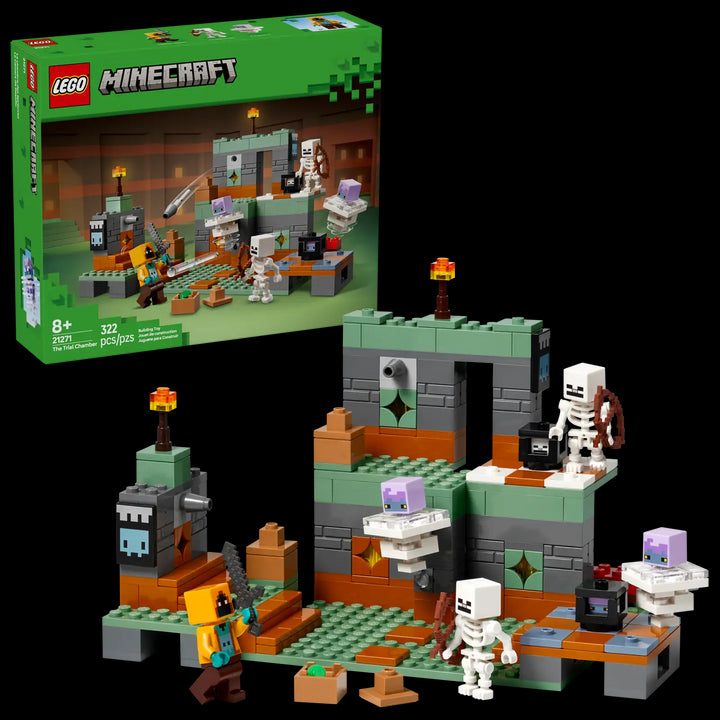 The Trial Chamber (21271) is a high-quality LEGO® Minecraft® toy for kids aged 8 and up. This building toy for boys and girls is a hands-on video game set that takes kids on a thrilling treasure hunt where players must battle mobs and dodge missiles as they progress. This creative building toy is set in the Minecraft trial chamber. It includes 2 skeleton figures, 2 breeze figures, a Shadow Hoodie minifigure and 2 spawners. There are 2 flick-fire missile launchers – 1 on each wall – and a spring-loaded missile with a trigger behind the rear wall. 3 pots, each hiding either an emerald or a diamond, contain the sought-after treasure. For more play possibilities, a room at the back of the set is equipped with a bed and table. For digital fun, the LEGO Builder app lets kids zoom in, rotate models in 3D and track their progress.