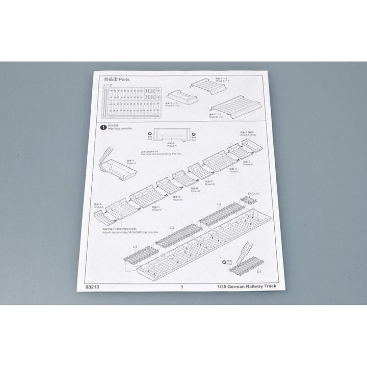 00213 1/35 German Railway Track Set Plastic Model Kit by Trumpeter delivers a realistic diorama base for military vehicle enthusiasts and experienced scale model hobbyists.
