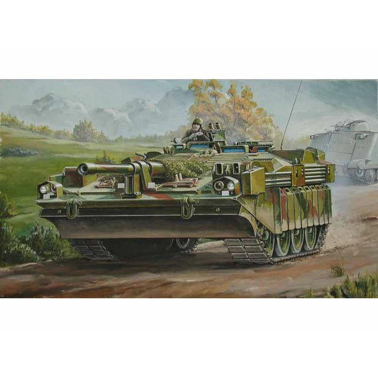 The main armament is a 105mm rifled tank gun fed by an automatic loader mounted at the rear of the hull. The height of the gun is controlled by the driver by raising or lowering the suspension rather than having a separate turret which would allow for ration and elevation/lowering of the main gun, the suspension was designeed to allow the entire front of the tank to be elevated or lowered.
