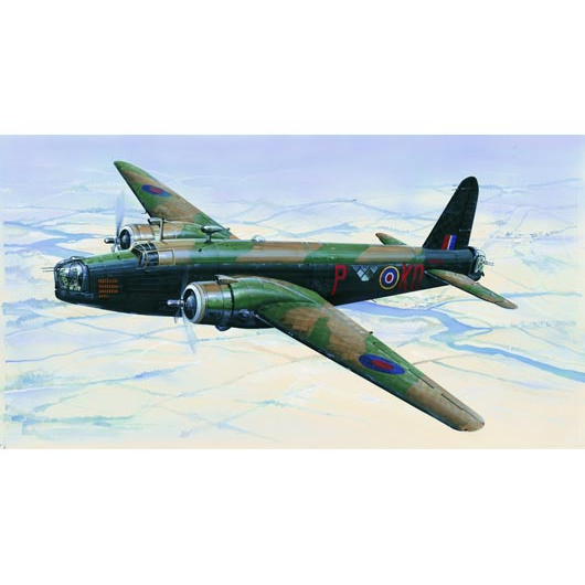 The Wellington was the most important British bomber of the initial war period. The prototype first flew in June 1936. Deliveries to RAF bomber squadrons began in 1939. During war period it operated from bases in Great Britain, India, the Middle East, North Africa and Italy. Although fairly modern by its looks, technologically the Wellington was very much a product of an era past. By 1942 slow speed, limited ceiling, and a small bomb load made the Wellington obsolete in the European theatre of operations. Although once it had been supplanted from the European theatre Lancasters and Halifaxes it flew until the war's end in other roles and in other theatres. In particular, it had been used by RAF. as trainer until 1953. A total of 11,461 Wellington's of all variants were built - the most of any British bomber design. Wingspan: 26.26 m Length : 19.68 m Height: 6.76 m Empty Weight: 9,510 kg Max.Weight: 15,650 kg Speed: 420 km/h Ceiling: 6,950 m Range: 3,285 km: