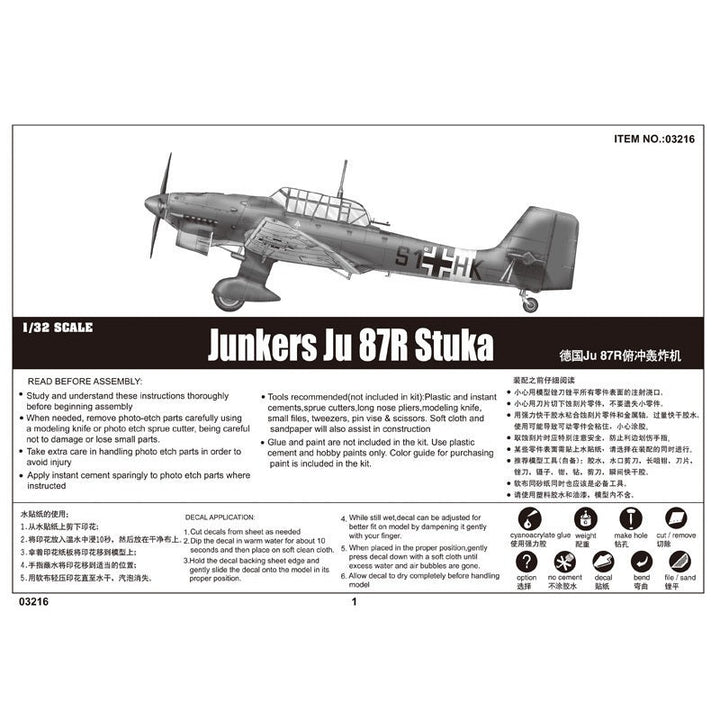 03216 1/32 Junkers Ju 87R Stuka Plastic Model Kit by Trumpeter delivers a highly detailed replica for aviation enthusiasts and experienced scale model hobbyists.