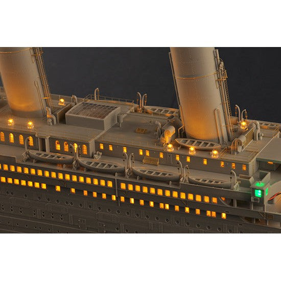 This is a plastic model kit that requires assembly. Paint and glue are required for completing the model. Use modelling tools to carefully remove parts from the sprues and follow the instructions for assembly. The included LED light set requires careful installation according to the instructions. Once assembled, painted, and illuminated, display your Titanic model with pride using the included display stand.