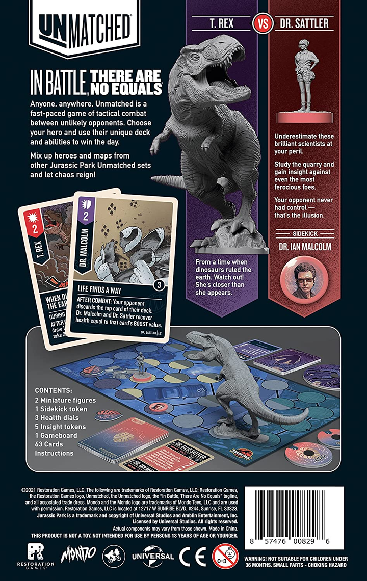 Jurassic Park: Dr. Sattler vs. T. rex is a stand-alone two-player expansion for the Unmatched system and includes: