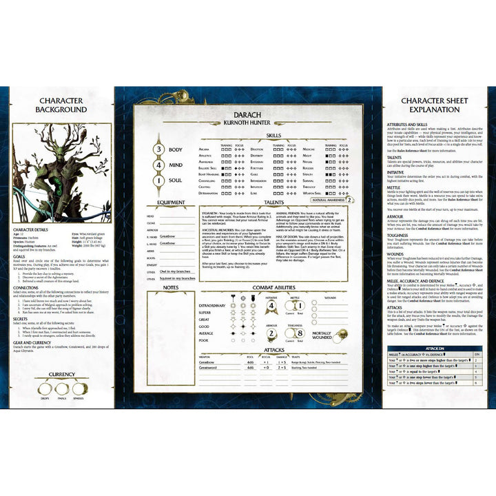 - Three two-sided rules reference sheets with rules for Tests, combat, and spellcasting.