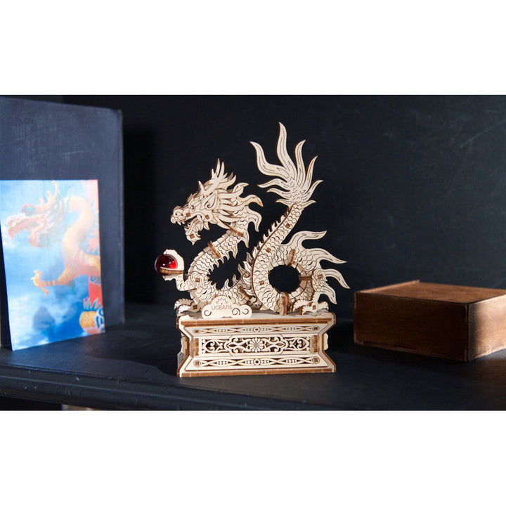 The Ugears Wood Dragon is a 3D puzzle box and DIY model of a lucky dragon clutching a fiery red pearl in its left claw. The long, coiled, four-limbed Wood Dragon, styled after representations of dragons in Chinese art, sits atop a special stand with a hidden drawer that springs open when a secret button, disguised as a flower, is pressed (the drawer closes manually). The Dragon is completely detachable and can be stood up on any surface and admired separately from the stand. Store a secret message, fortune or small treasure inside the Wood Dragon's base. You could even place a special red envelope (known as 紅包, or hóngbāo) inside the drawer, enclosing a Lunar New Year's gift, then present the Wood Dragon with both hands and challenge the recipient to open the treasure box!